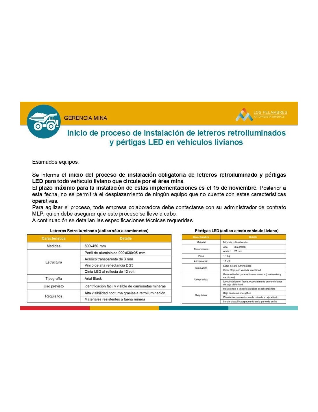 Exigencia obligatoria de letreros retroiluminado para todo vehículo liviano que circule por el área minera de Pelambres, Antofagasta Minerals a partir del 15 DE NOVIEMBRE 2025.